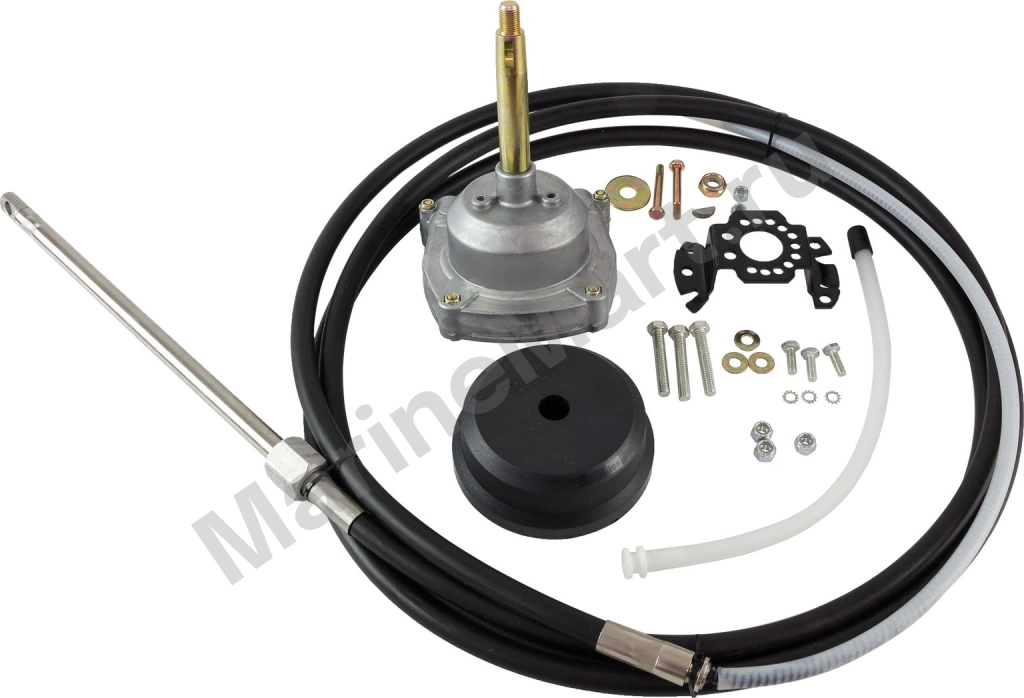 Редуктор, установочный комплект, рулевой трос. Планетарный рулевой редуктор для подвесных лодочных моторов мощностью до 150 л.с. Длина троса: 3,96 Для моторов мощностью: до 150 Кол-во оборотов: 3,8 Макс. диаметр рулевого колеса: 16 " (406,4 мм) Материал сердечника: Стальной Модель редуктора: 3000 Производитель: Pretech Размеры: 530x630x160 Стандарт троса: M66 Страна производителя: Южная Корея